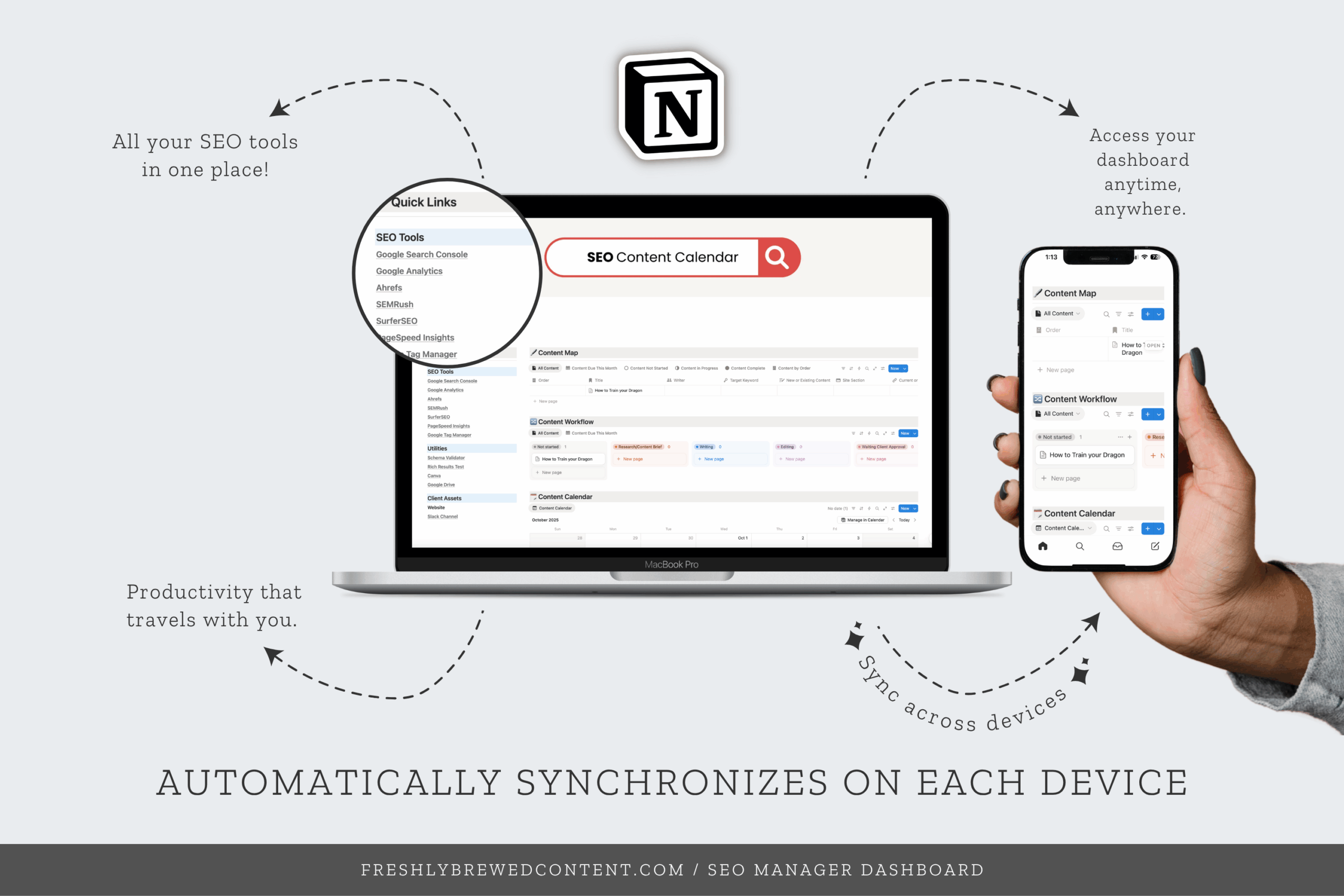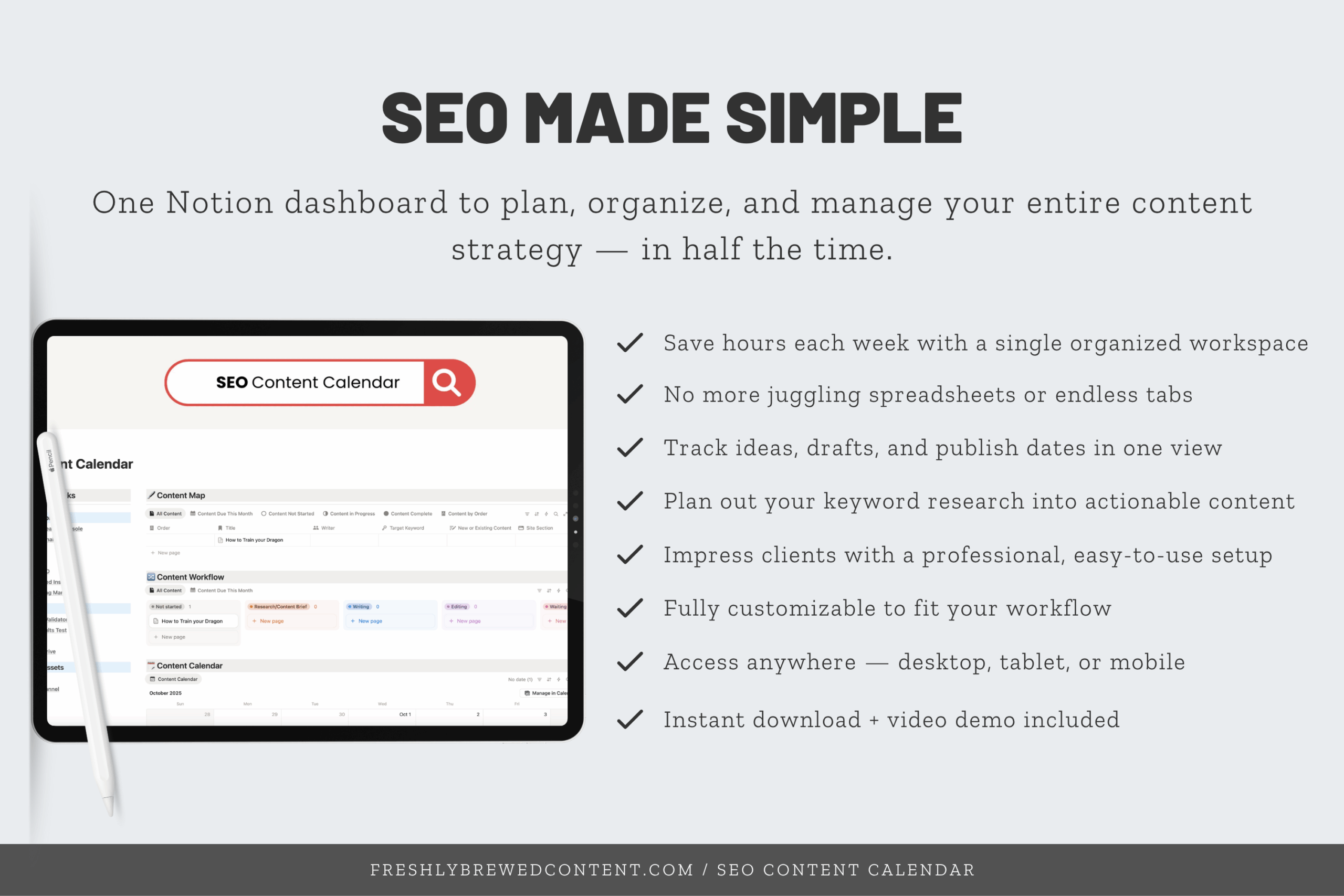 This Notion template is part of the Freshly Brewed Content SEO Dashboard Collection, designed to help marketers and creators simplify their systems, stay consistent, and focus on strategy (not spreadsheets).