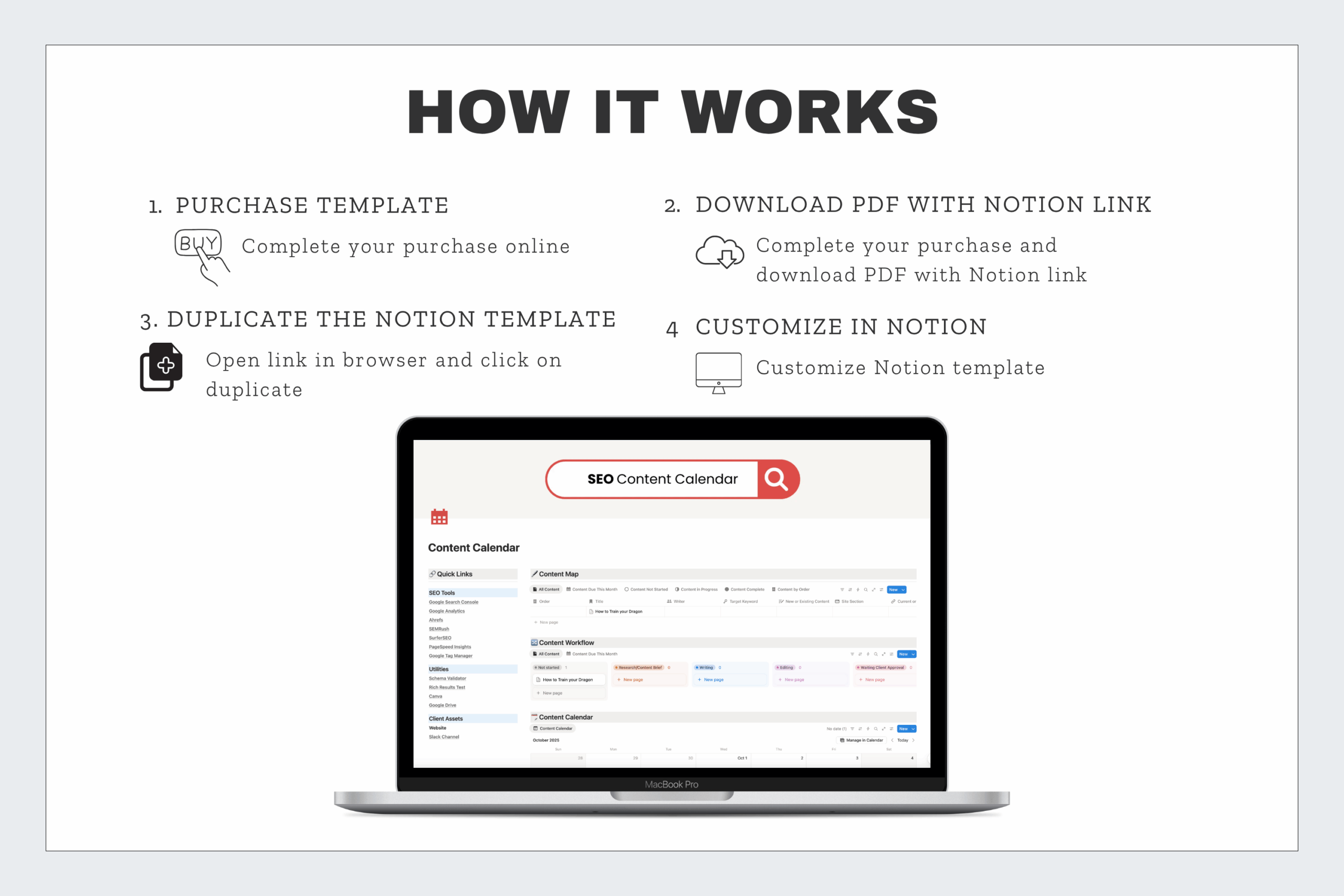 The SEO Content Calendar includes a pre-built Notion workspace designed to help you plan, track, and publish your content with ease. You’ll get a calendar view, content map, keyword tracking fields, and custom tags for managing your blog posts or campaigns — all in a simple, ready-to-use layout