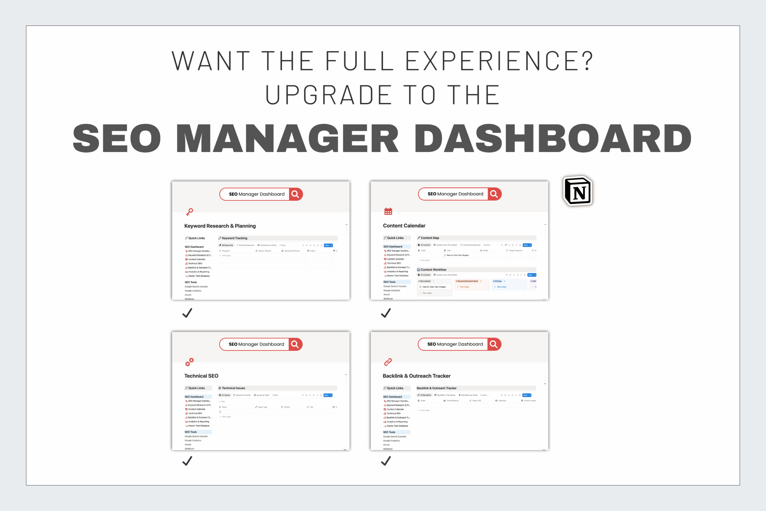 When you’re ready to take it further, you can upgrade to the complete SEO Manager Dashboard, which includes: