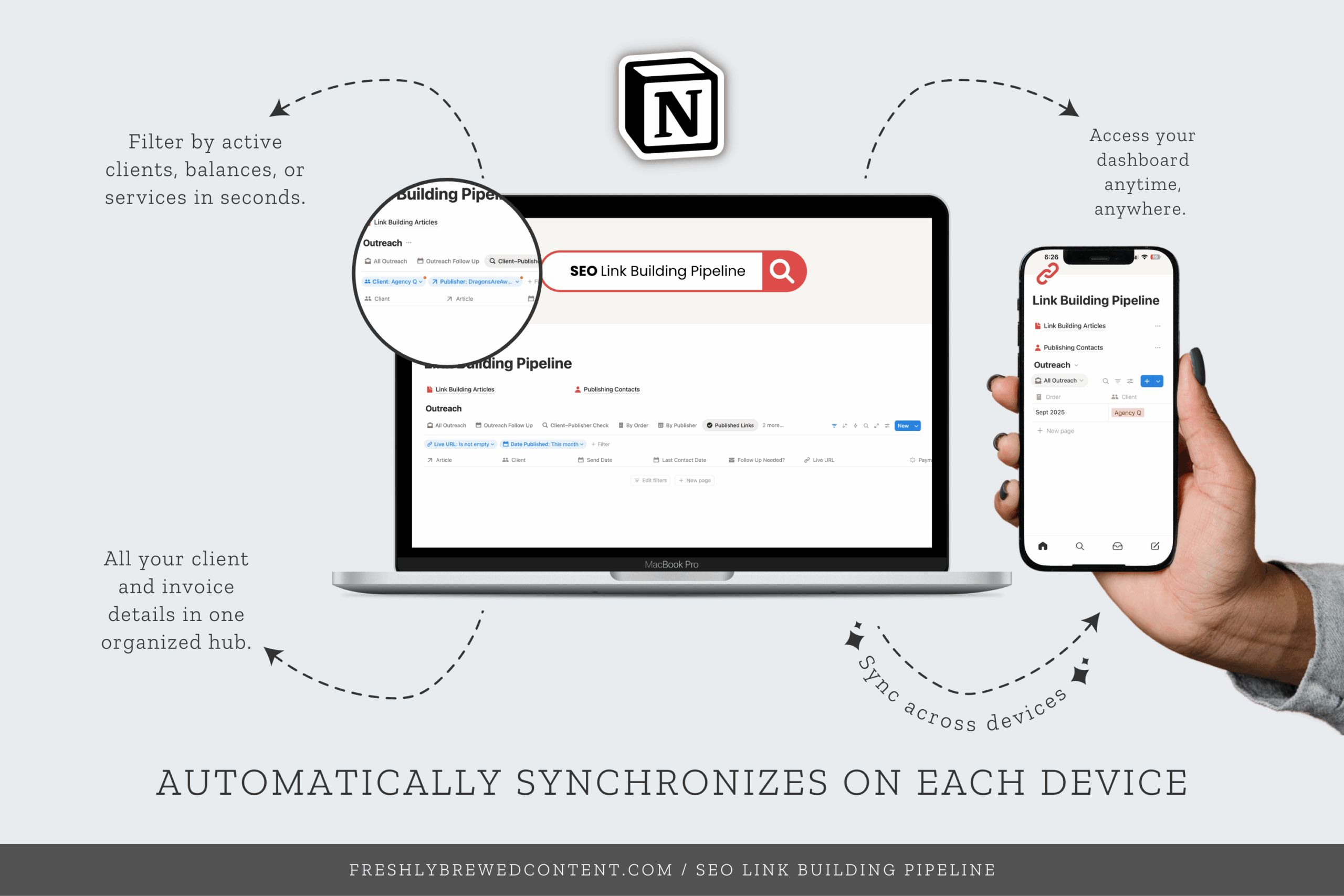 Unlike a basic spreadsheet, a Notion dashboard is interactive and customizable. You can create databases, tag publishers, and set reminders for follow-ups. Plus, since Notion works on desktop, mobile, and the Notion app for Mac or Windows, you’ll always have your link building system on hand.
