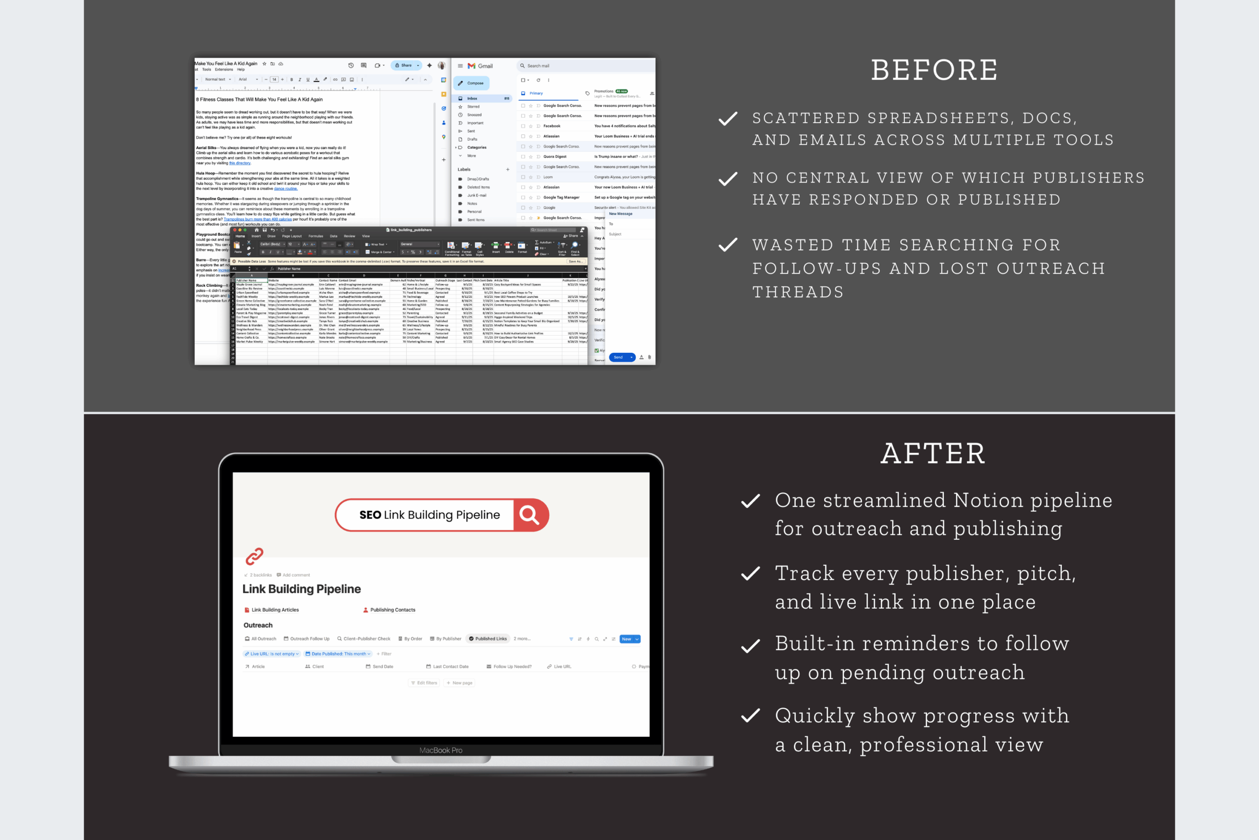 Spreadsheets get messy fast. The Link Building Pipeline is built in Notion, so you can filter, tag, and set reminders. It’s easier to update and much more flexible.