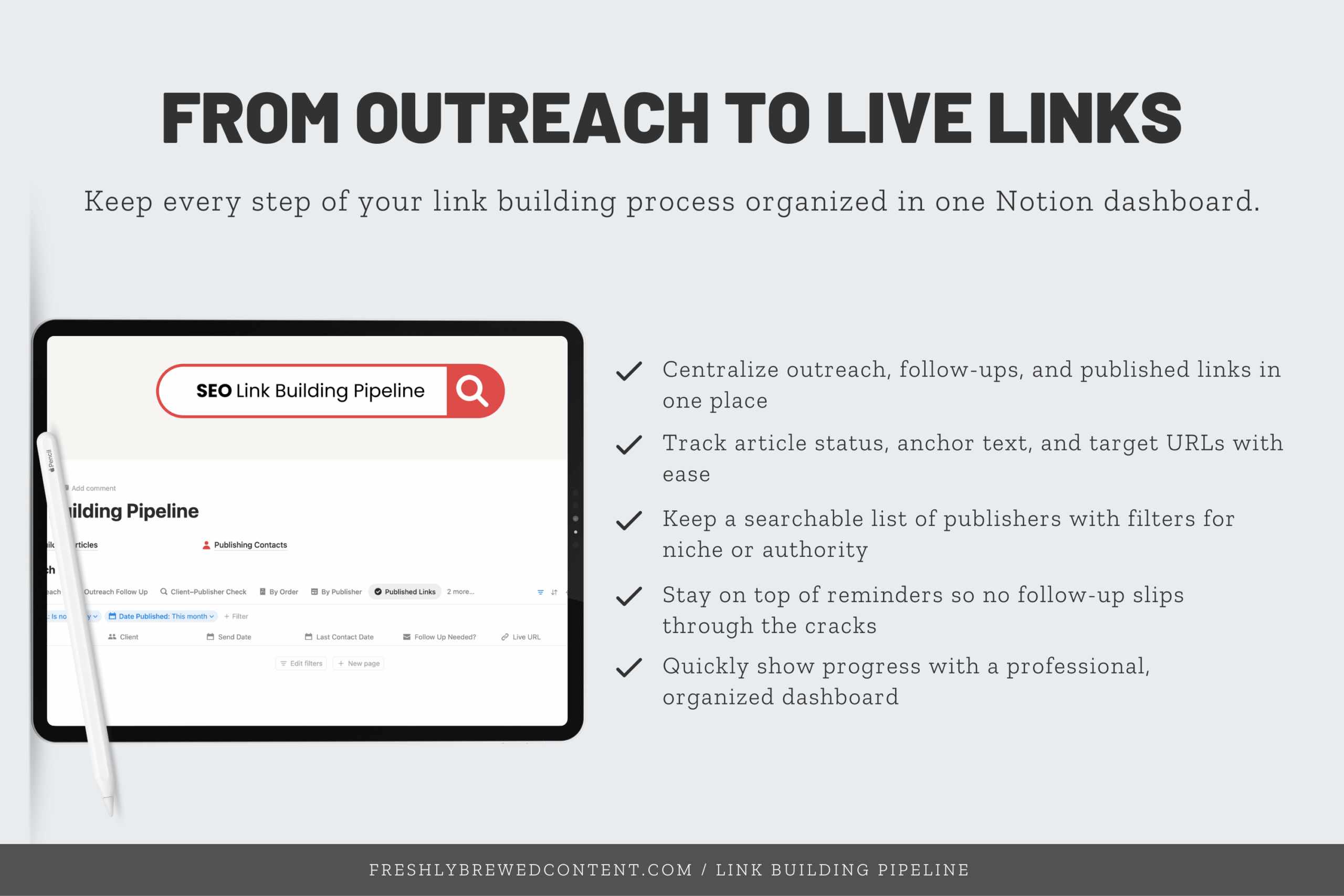 Stop losing track of outreach emails and publisher lists—manage everything in one organized Notion dashboard. The Link Building Pipeline is a ready-to-use Notion template that helps you log contacts, track follow-ups, and record published links without messy spreadsheets.
