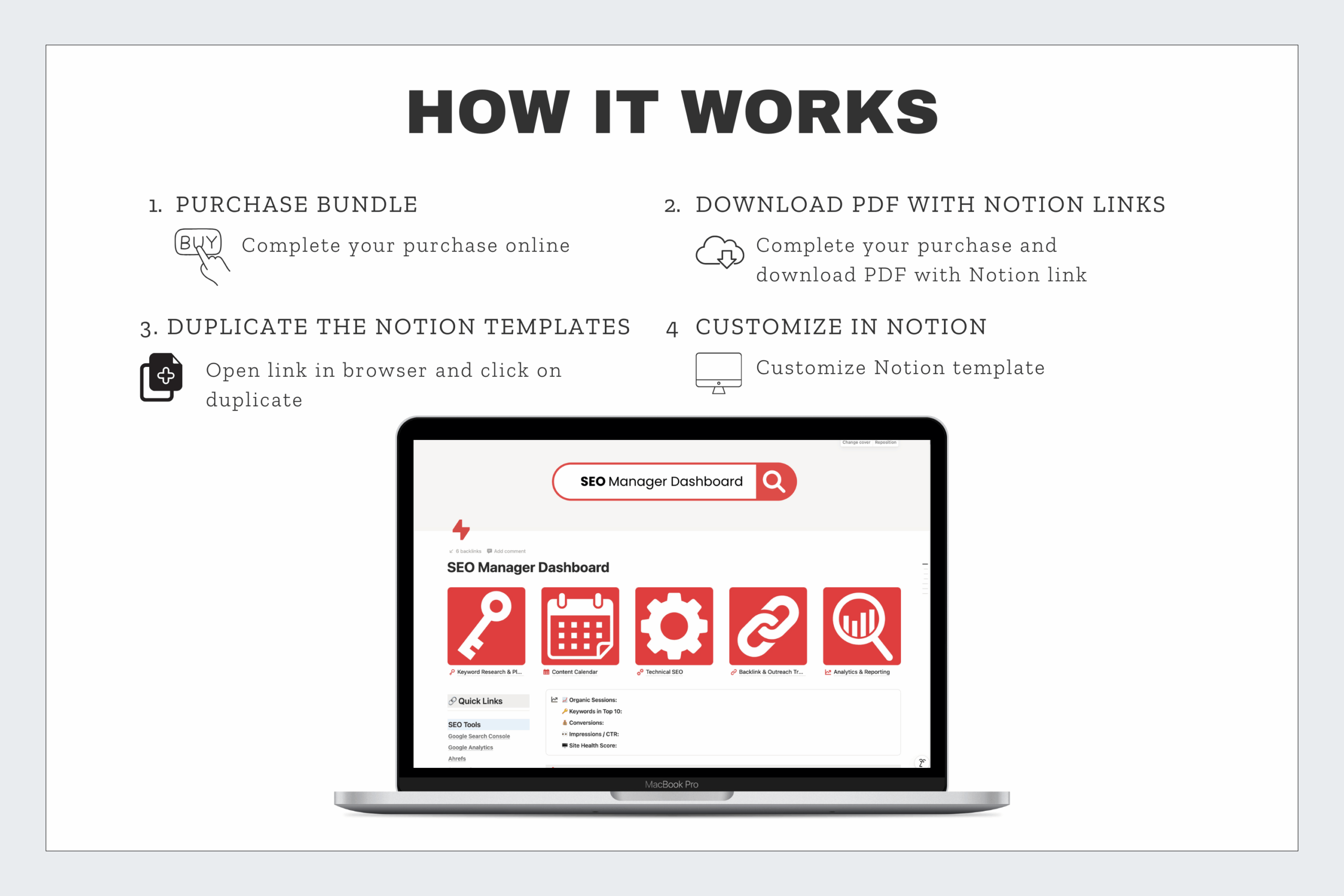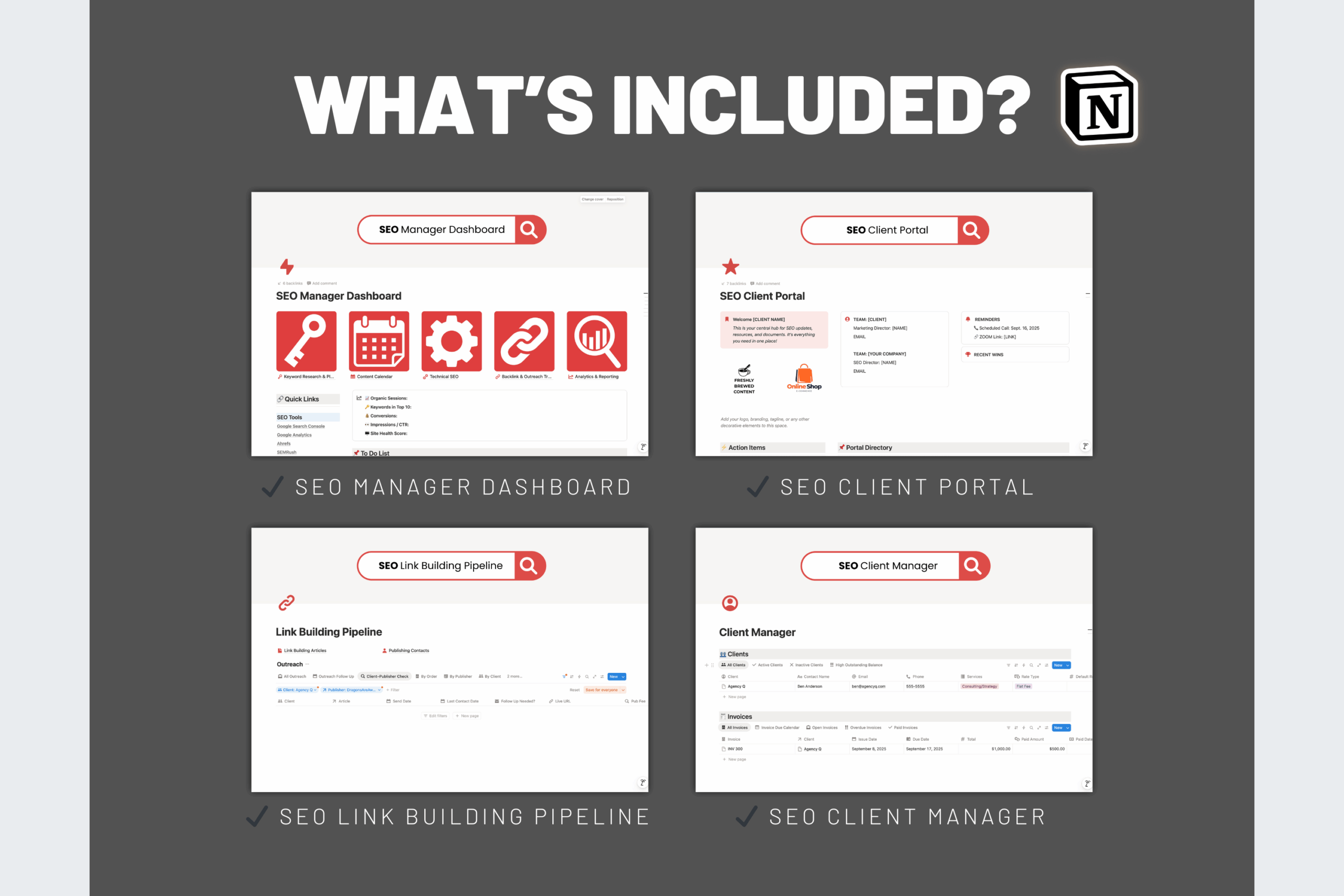The SEO Mega Bundle for Notion brings everything together in one system. You’ll get four powerful dashboards—the SEO Manager, Link Building Pipeline, Client Portal, and Client Manager. Together, they create a complete workflow for managing both the technical and client-facing sides of SEO.